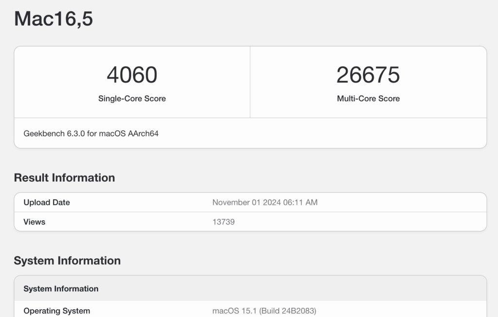 Geekbenchに上がってきた「Mac16,5」はMacBook Pro搭載のもののようでM4 Max16コアCPUと128GB RAMを内蔵した性能となっています。