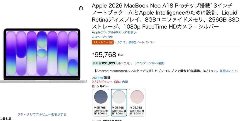 Amazonで「MacBook Neo」が約4%オフの95,768円で販売されています。